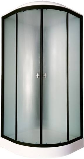 Сборка кабины без герметика! Передние стекла матовые, задние стенки СТЕКЛЯННЫЕ белые, черный алюминиевый профиль, черная задняя панель, полукруглый низкий поддон 15см + верхние - поворотные ролики с регулировочным винтом, нижние - поворотные ролики с кнопкой; с полкой на задней панели.